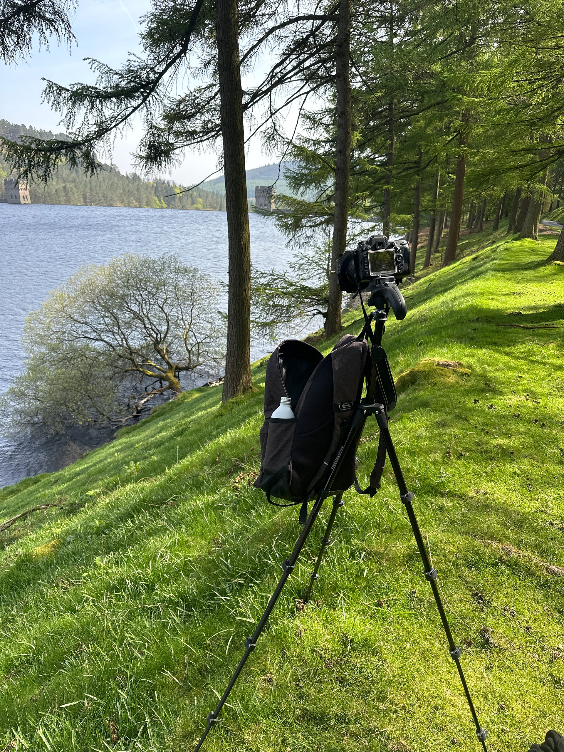 I’ve come down to Derwent Water. It’s spring but I can only stay from midday through the afternoon, so unfortunately, I won’t be able to stay for sunset. Disappointingly, the lighting wasn’t ideal either. The sky was mostly blue, with only a faint layer of high-level clouds that were almost transparent on camera, coming out as a solid white sky with no detail. So, I focused on the banks of the water, the trees, and the shards of light coming through the canopy and onto the grass below. I was looking for details—patterns in the trees, gates, reflections in the water, shapes, textures, shadows, and light—doing my best to avoid the sky where possible.